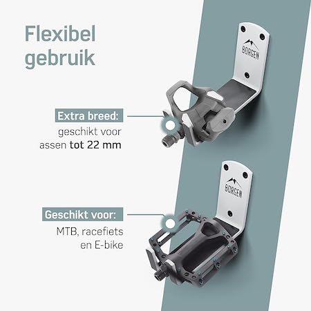 Hij is geschikt voor elk type fiets. Het is enkel opletten met de pedalen. Pedalen van XLC, de Crankbrothers Stamp en RaceFace Atlas pedalen zijn helaas niet compatibel met de wandhouder.