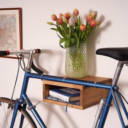 Dit mooie houten dingetje ziet er zonder fiets uit als een decoratief plankje en doet zeker niet aan een fietsaccessoire denken.