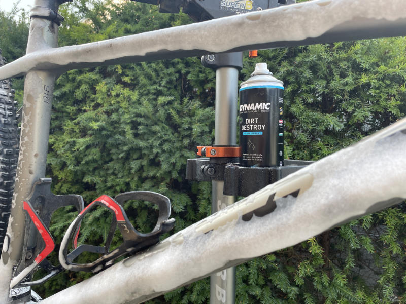 Het product waar ik het meest benieuwd naar was was de Dynamic Dirt Destroy foam spray, waarmee je zelfs zonder water je hele fiets kan schoonmaken…