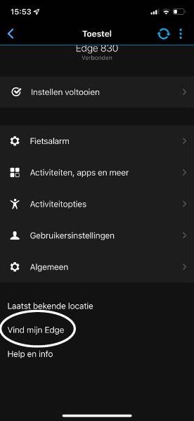 Als laatste heb je nog de “find my edge” functie. Met deze functie vind je je Edge altijd terug moest je deze kwijt spelen onderweg. Het is wel noodzakelijk dat de Garmin Connect app op je smartphone verbonden is met de Edge via Bluetooth.