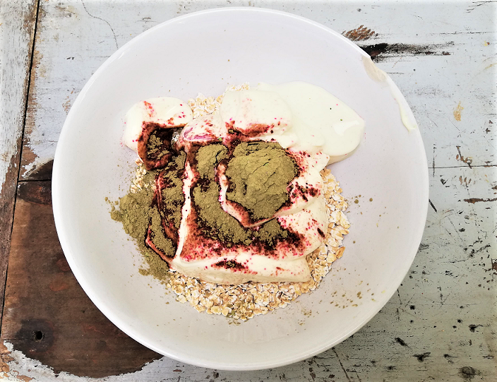 Toen ik het echter door mijn ontbijt van havermout en yoghurt mengde kwam de ware aard van dit toverpoeder tevoorschijn. Het geheel werd namelijk mooi roze/rood van kleur, wat, na er even bij stil te staan, vermoedelijk vooral te danken is aan de rode bieten die er in verwerkt zitten.